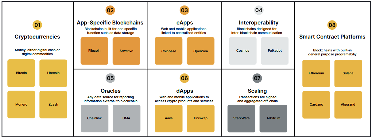 Während sich die ersten beiden Ebenen hauptsächlich auf die Netzwerke und Protokolle konzentrieren, gilt nur der dritte Level für Token. Der Krypto-Stack bezieht sich auf die Arten von Krypto-Assets, die das Krypto-Ökosystem ausmachen. Diese Kategorie umfasst Klassifizierungskriterien wie Smart Contract-Plattformen, Kryptowährungen oder dApps. Stufe 2 wird weiter in Sektoren und Branchen unterteilt. Zu guter Letzt versucht Level 3, die Vermögenswerte in ihre entsprechenden Oberklassen einzuordnen. Sie werden in Kapitalanlagen, Wertaufbewahrungsmittel oder Konsumgüter unterteilt.