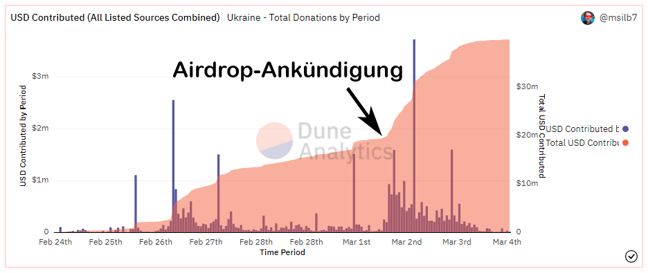 Der Schnappschuss wurde am Morgen des 2. März angekündigt, um alle Spender mit einem Token-Drop zu belohnen und einen Anreiz für weitere Gelder zu schaffen. Wie sich an der obigen Grafik sehen lässt, führte dies zu einer raschen Verdopplung der Ethereum-basierten Spenden von 20 auf 40 Millionen. Zusammen mit den Hilfsmitteln auf Bitcoin und Polkadot hat die Ukraine über 55 Millionen US-Dollar an Krypto-Spenden erhalten - verglichen mit den 20 Millionen USD der Vereinten Nationen (UN) eine beachtliche Summe.