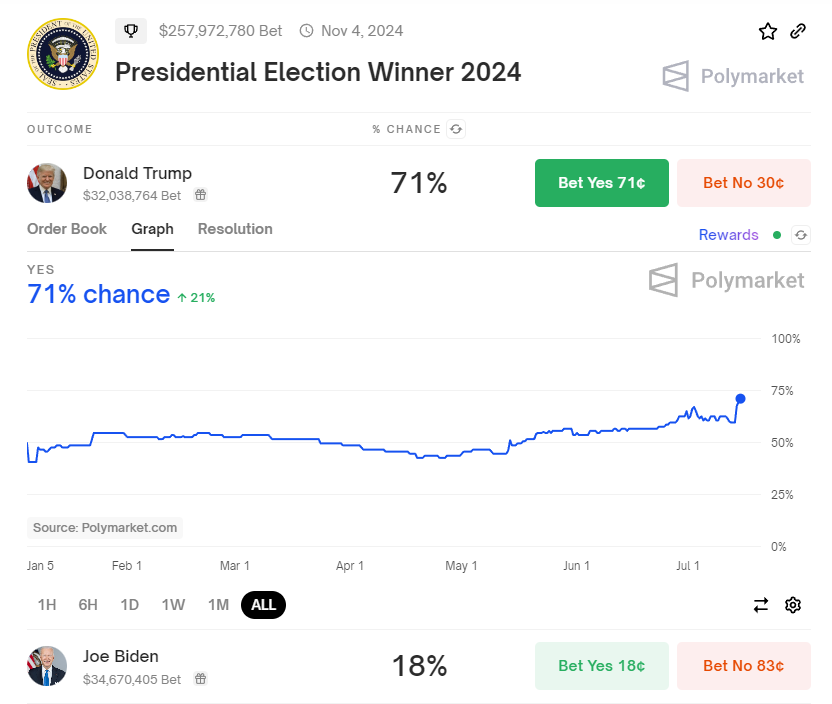 Über 257 Millionen USD an Wettvolumen auf der Krypto-basierten Börse Polymarket preisen zu 71% einen Trump-Sieg ein. Vor dem versuchten Attentat handelte der Markt um die 55%. Währenddessen zweifeln ehemalige Biden-Wähler gar an seinem Antritt als Kandidat der Demokraten.