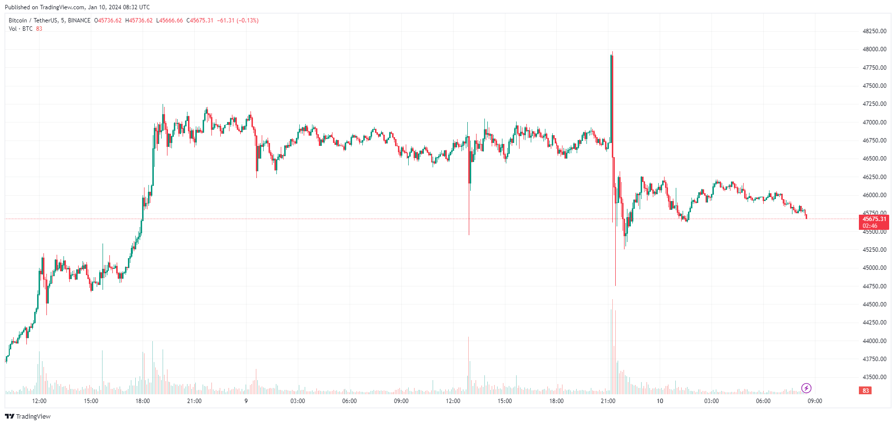 Zwar reagierte der Bitcoin-Preis sofort auf den Twitter-Beitrag mit einer rund 2%igen Rallye auf 48'000 USD. Doch Skepsis wuchs schnell und der Aufschwung hielt nur für vier Minuten an. Allmählich realisierten Händler, dass es sich um eine Falschmeldung handelte. Der Bitcoin-Preis korrigierte um -6.17%.