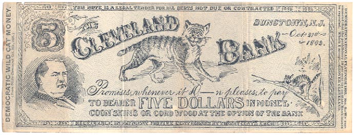 Einigen Quellen zufolge stammt der Begriff von einer Bank in Michigan, die eine private Papierwährung mit dem Bild einer Wildkatze ausgab. Nachdem die Bank gescheitert war, wurden schlecht gedeckte Banknoten als "Wildcat Money" und die Banken, die sie ausgaben, als "Wildcat Banks" bekannt. Eine gängige Vorstellung von der Wildcat-Bank in Western Romanen und ähnlichen Geschichten war die einer Bank, die in ihrem Tresor ein Fass voller Nägel, Getreide oder Mehl mit einer dünnen Schicht Bargeld darauf ausstellte und so den Einlegern vorgaukelte, es handle sich um ein erfolgreiches Geschäft. Der Vergleich der Federal Reserve Bank bringt ihre Abneigung gegenüber privat ausgegebenen Währungen gut zum Vorschein.