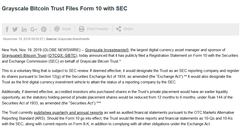 Sonnenshein, seinerseits Geschäftsführer des weltweit grössten Digital Asset Managers erklärte im Interview, Grayscale habe bei der SEC zu Beginn der laufenden Woche eine Registrierungserklärung (Form-10) für den eigenen börsennotierten Bitcoin Fonds Grayscale Bitcoin Trust (GBTC) eingereicht. Grayscale Investments bietet Investoren durch Aktien in einem Krypto-Trust eine gewisse Rechts- und Sicherheitsinfrastruktur. Im Falle, dass die SEC diesen Antrag genehmigt, würde der Bitcoin Trust als "SEC Reporting Company" eingestuft werden. Dies wiederum würde institutionellen Investoren, einen erleichterten Zugang zu digitalen Assets über den Grayscale Bitcoin Trust ermöglichen.
