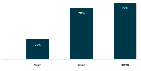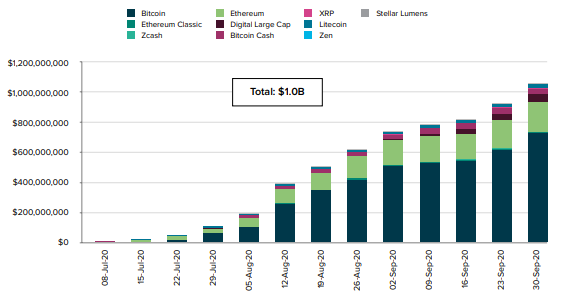 Der Grayscale Bitcoin Trust macht immer noch etwa 70% der Investitionen aus, was in diesem Quartal ungefähr 720 Mio. USD entspricht. Die Zuflüsse in den Grayscale Bitcoin Trust waren proportional zu etwa 77% der gesamten Bitcoin-Minings im 3Q20. Während das Mining kontinuierlich Angebot auf den Markt bringt, wird ein ähnlicher Anteil des Angebots durch Investitionen in den Grayscale Bitcoin Trust vom Markt genommen.