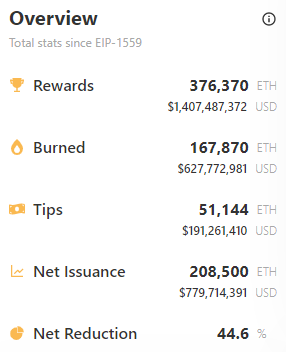 Das Ethereum-Netzwerk ging vor dem Upgrade von einer Burn-Rate von etwa 10'000 ETH pro Jahr aus. Nach einem knappen Monat wurden jedoch schon über 160'000 ETH verbrannt. Das entspricht knapp 600 Mio US-Dollar und wirkt sich, je nach Bewertung, auch auf die Marktkapitalisierung aus. Durchschnittlich wurde die Inflation der Kryptowährung bisher um rund 44% reduziert - eine beträchtliche Zahl.