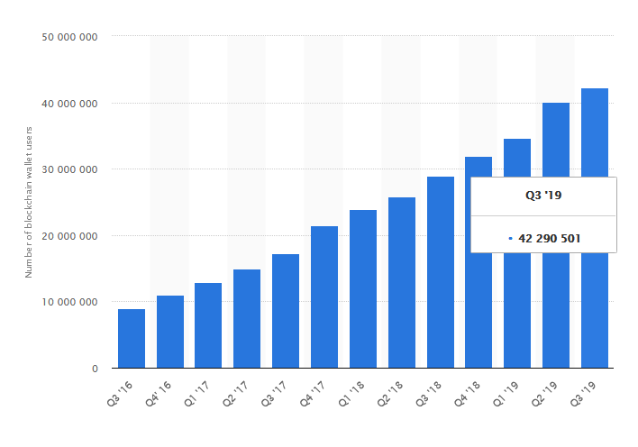 According to Statista, more than 42 million Bitcoin Wallets had been set up by the end of the third quarter of 2019. This number is also reflected on Blockchain.com. The chart shows a steady increase over the last three years from just under 9 million wallet addresses in Q3 2016 to 42 million addresses in Q3 2019. The number of wallet addresses has thus grown by an average of 155% over the last three years.