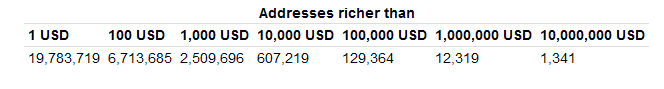 While the majority of addresses have a Bitcoin equivalent between $1 and $100, addresses with a value of $100 to $10,000 are still very well represented with just over 9 million addresses. As expected, the distribution in the upper segment is becoming thinner.