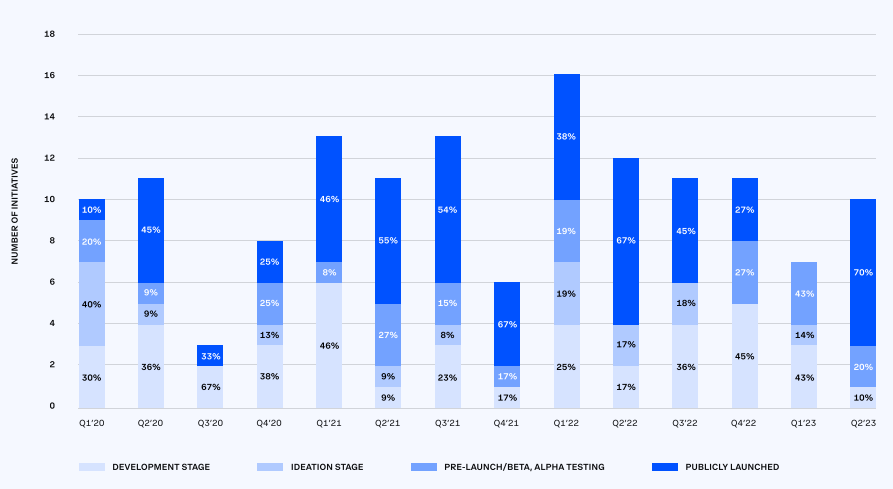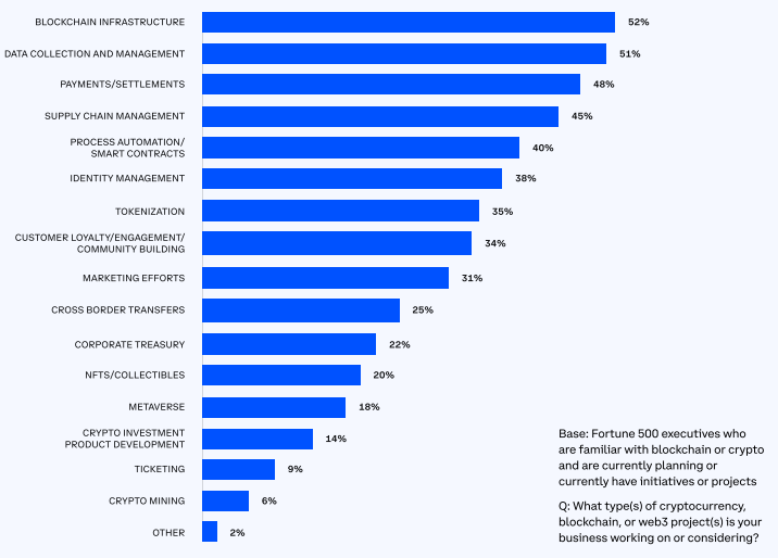 Die Fortune-100-Unternehmen investieren stark in Krypto-, Blockchain- und Web3-Technologien. Grund dafür ist ihr Potenzial zur Umgestaltung des globalen Finanzsystems. Von den mit Kryptowährung oder Blockchain vertrauten Fortune 500-Führungskräften betonen 64%, wie wichtig es ist, in diese Technologien zu investieren. Sie wollen damit einen Wettbewerbsvorteil erhalten. Die Studie unterstreicht die Bedeutung von Blockchain für die Datenerfassung, das Management, die Lieferkette und die Verbesserung des Finanzsystems im Allgemeinen. Aufgrund dessen wurden über die letzten Jahre mehrere Initiativen von den grössten Tech-Firmen und Bankgiganten lanciert.