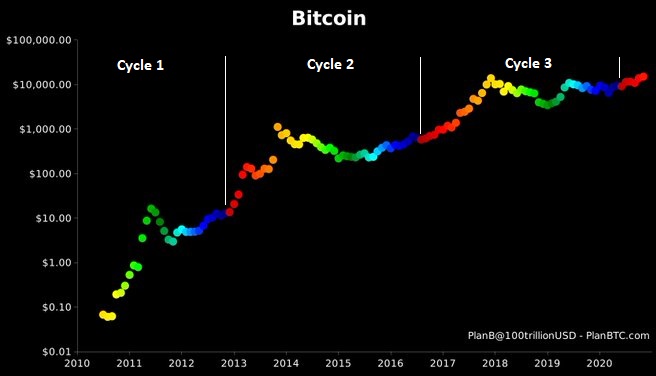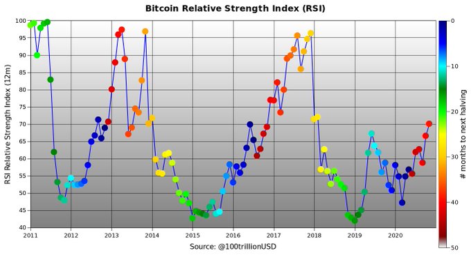 Wenn sich dieser vierte Zyklus auch nur annähernd in der Nähe der letzten drei Zyklen seit Beginn abspielt (was nicht garantiert ist), könnte der Index der relativen Stärke von Bitcoin im Jahr 2021 wieder recht extrem werden. Hier ist ein Chart von PlanB über den historischen monatlichen RSI von Bitcoin während der Aufwärts- und Abwärtsphasen des 4-jährigen Halving-Zyklus: