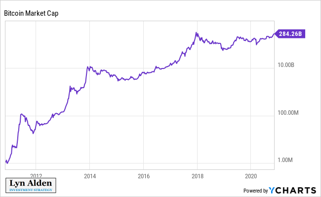 Hier liegt das Problem. Bitcoin hat eine Marktkapitalisierung von über 250 Milliarden Dollar. Zwei börsennotierte Unternehmen an den grossen Börsen, MicroStrategy (MSTR) und Square (SQ), besitzen ihn bereits, ebenso wie eine Vielzahl von Aktiengesellschaften an anderen Börsen und OTC-Märkten sowie Privatunternehmen und Investmentfonds. Grossinvestoren wie Cathie Woods, Paul Tudor Jones und Stanley Druckenmiller besitzen ihn ebenso, wie mindestens ein designierter US-Senator. Fidelity und eine Vielzahl von Grossunternehmen sind an den institutionellen Verwahrdienstleistungen beteiligt. Paypal (PYPL) ist daran beteiligt. Bundesstaatlich regulierte US-Banken können nun offiziell Krypto-Vermögenswerte verwahren. Die IRS behandelt Bitcoin für Steuerzwecke wie eine Ware. Das ist eine Menge Mainstream-Dynamik.
