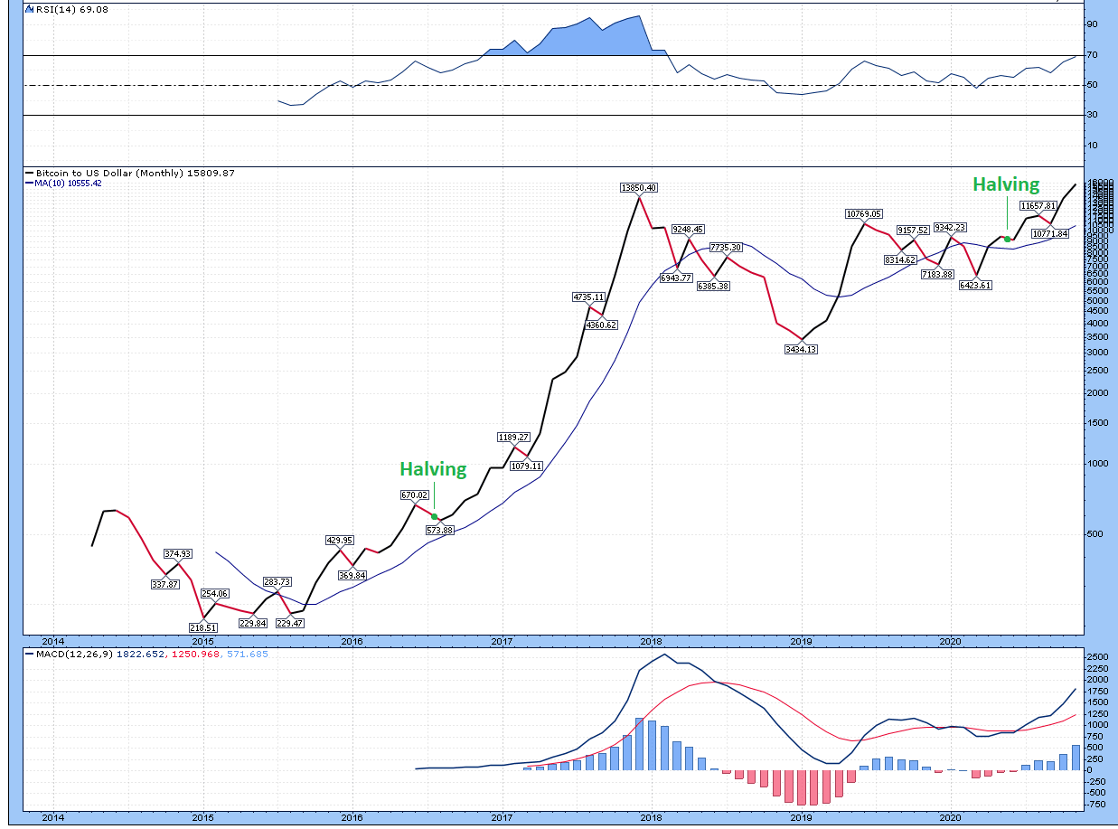 Aus diesem Grund veranlasst mich der Anstieg von Bitcoin von $6.900 auf über $17.000 in sieben Monaten noch nicht zu Gewinnrealisierungen. Mit anderen Worten, ein monatlicher RSI von 70 bedeutet nicht, dass Bitcoin als "überkauft" eingestuft wird, insbesondere so früh nach einem Halving. Ich werde mich jedoch wahrscheinlich später im Jahr 2021 mit einer gewissen Neuausrichtung befassen.