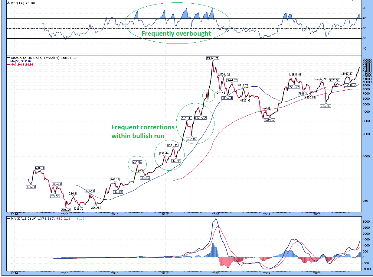 Der Chart zeigt, wie oft Bitcoin kurzfristig überkauft war und wie viele Korrekturen er bei seinem vorherigen Aufwärtstrend nach der Halbierung hatte, bei dem er um das 20fache gestiegen ist: