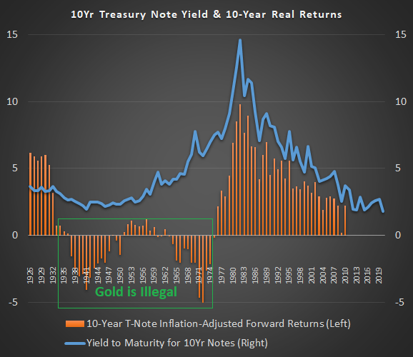 Diese Grafik zeigt den Zinssatz der 10-jährigen Treasury-Renditen in blau. Die orangefarbenen Balken stellen die annualisierte, inflationsbereinigte Rendite dar, die Sie erhalten würden, wenn Sie in diesem Jahr ein 10-jähriges Staatsanleihen kaufen und es über die nächsten 10 Jahre bis zur Fälligkeit halten würden. Das grüne Quadrat zeigt den Zeitraum, in dem der Besitz von Gold illegal war.