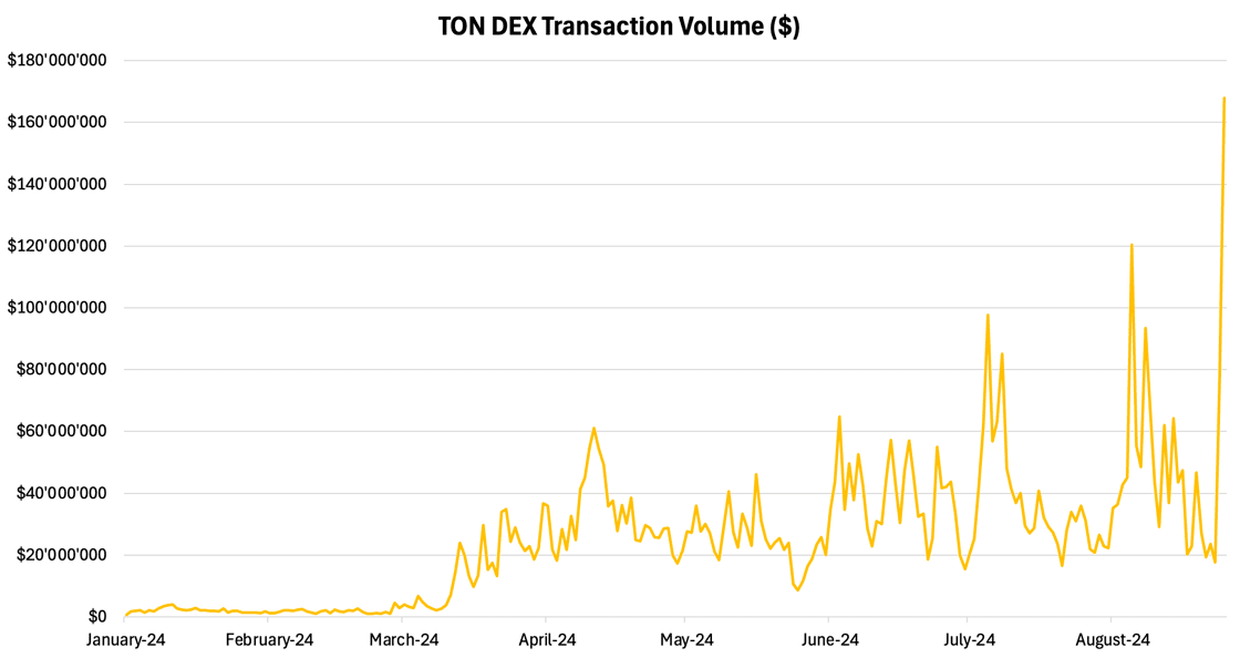 Zum Beispiel erreichte das Transaktionsvolumen bei dezentralen Börsen (DEX) 167 Millionen US-Dollar nach Durovs Verhaftung, was darauf hindeuten könnte, dass Einzelpersonen aus TON aussteigen und in andere Vermögenswerte wechselten. Dennoch zeigte das DEX-Transaktionsvolumen von TON vor den potenziellen Problemen von Telegram einen robusten Aufwärtstrend. Das Wachstum des Transaktionsvolumens deutet darauf hin, dass Nutzer und Entwickler weiterhin aktiv mit dem Netzwerk interagieren, was auf Vertrauen in das langfristige Potenzial hinweist.