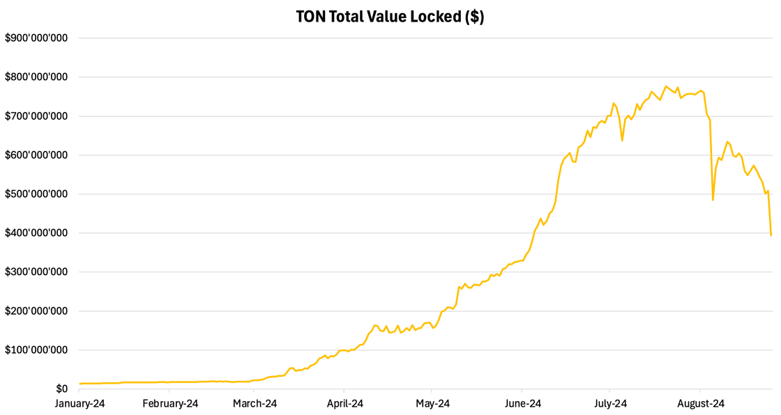 Dies spiegelt sich im enormen Wachstum des Total Value Locked (TVL) wider, einem Krypto-Indikator für verwaltete Vermögenswerte. Das TVL war zu Jahresbeginn bei lediglich 13.5 Millionen US-Dollar und erreichte am 20. Juli dieses Jahres einen Höchststand von 776 Millionen US-Dollar. Obwohl das TVL derzeit auf etwa 400 Millionen US-Dollar gesunken ist, ist es dennoch um 2'820% in diesem Jahr gestiegen. Der aktuelle Rückgang ist grösstenteils auf den erwähnten Preiseinbruch von TON zurückzuführen.