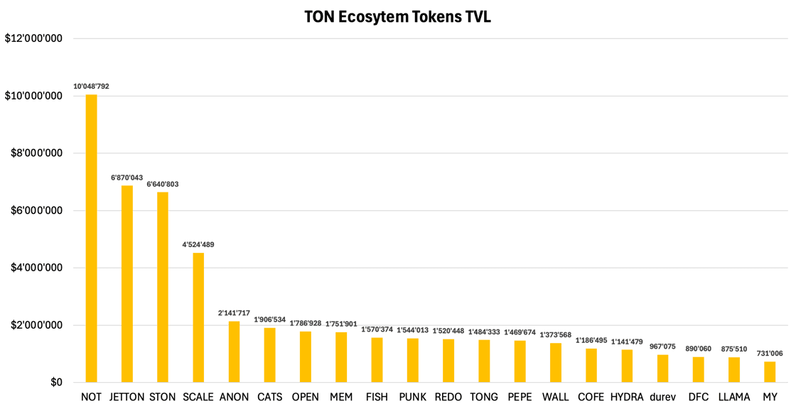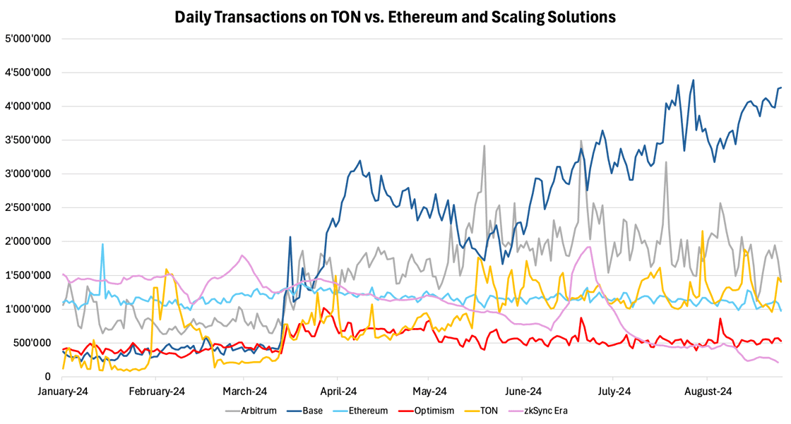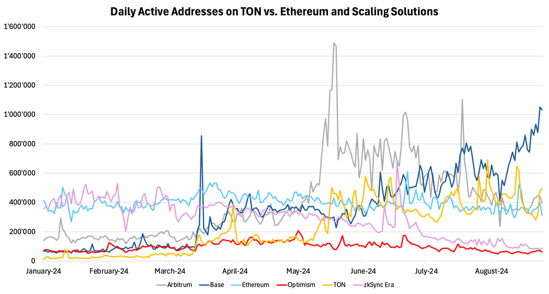 Ebenso wird TONs zunehmende Aufmerksamkeit durch das Überholen der täglichen aktiven Nutzer von Ethereums Mainnet hervorgehoben. Derzeit verzeichnet TON fast 500'000 tägliche Nutzer, 33 % mehr als auf der Plattform des Smart-Contract-Riesen. Ausserdem liegt TON im Vergleich zu Ethereum-Scaling-Lösungen nur hinter Base, wenn es um aktive Adressen geht! Dies ist bemerkenswert, da Base, ähnlich wie TON, eine grosse, bestehende Nutzerbasis (über Coinbase) hat, was die Effektivität der Ansprache eines aktiven und bestehenden Marktes unterstreicht.