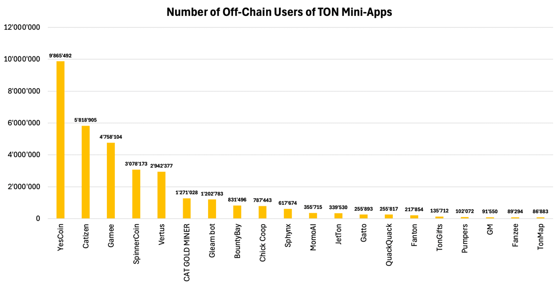 Die beträchtliche Anzahl an Off-Chain-Nutzern hebt die starke Retention des Mini App-Ökosystems hervor. Viele dieser Apps verlassen sich auf Off-Chain-Komponenten, ein Trend, der sich wahrscheinlich verstärken wird, da Web3-Spiele auf nachhaltiges Kostenmanagement setzen. Dies spiegelt die Nutzer Nachfrage und ihr Engagement wider und zeigt die erfolgreiche Integration zwischen Telegram und TON.