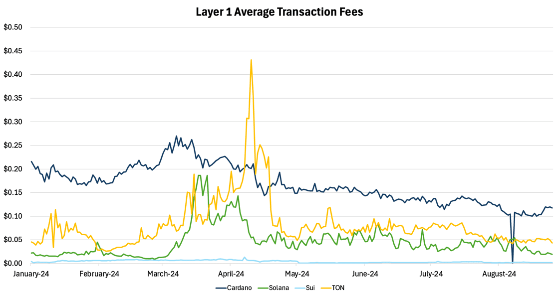 Trotz des explosiven Wachstums von TON zeigte das Netzwerk eine bemerkenswerte Skalierbarkeit. Während vergleichbare Netzwerke mit steigenden Gebühren zu kämpfen haben, blieben bei TON die durchschnittlichen Transaktionskosten unter 0.10 Dollar. Dies steht im Gegensatz zu Netzwerken wie Cardano, das trotz deutlich geringerer Akzeptanz und weniger Anwendungen routinemässig höhere Gebühren aufrechterhält. Selbst als die Aktivität zunahm, erreichte die Gebühr nur knapp 0.45 Dollar. Obwohl dies teurer ist als bei Blockchains wie Sui und Solana, ist es wichtig zu beachten, dass die Hauptchancen von TON darin liegen, eine Vielzahl neuer Krypto-Einsteiger aus dem Web2-Bereich zu gewinnen. Diese Nutzer priorisieren einen benutzerfreundlichen und vertrauten Prozess, den TON bietet, im Gegensatz zu geringfügig niedrigeren Transaktionskosten.