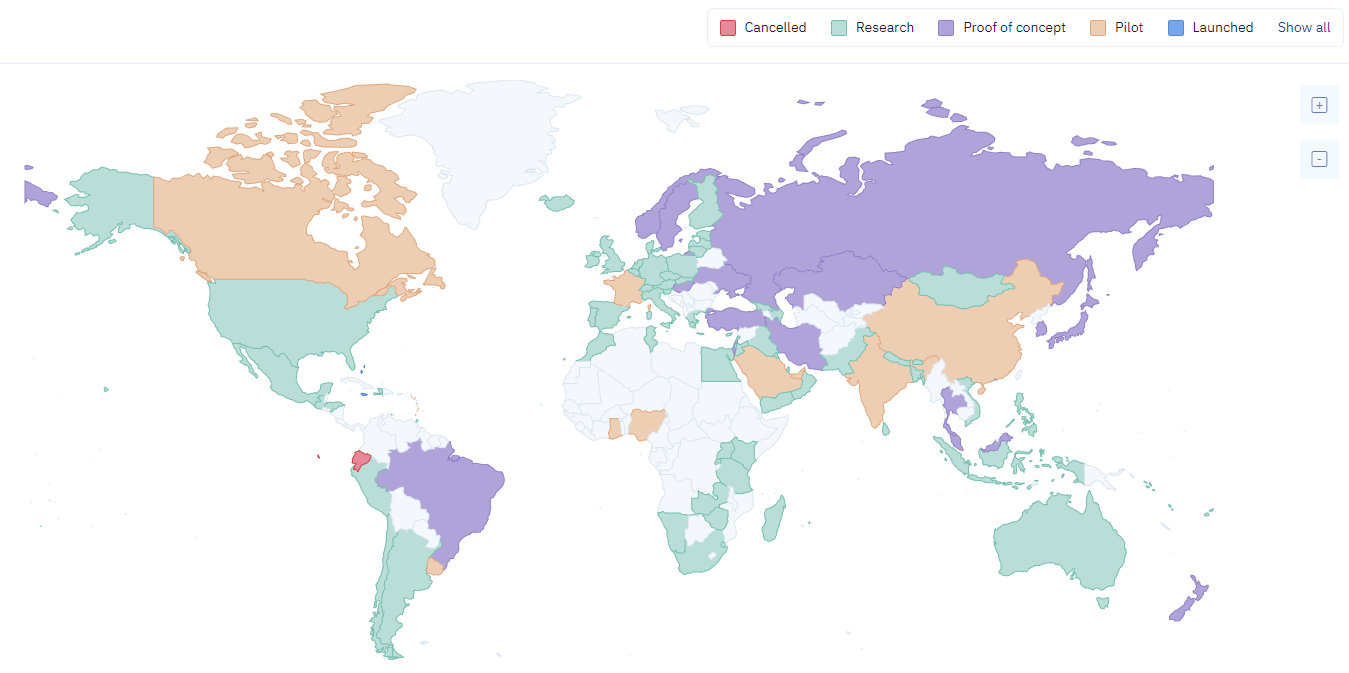 Nach Angaben der Denkfabrik Atlantic Council erforschen neun von zehn Zentralbanken auf der ganzen Welt derzeit den Einsatz von CBDCs, während fast ein Dutzend Länder bereits eigene digitale Währungen eingeführt haben. Zusammen repräsentieren sie Volkswirtschaften, die mehr als 95% des globalen BIP ausmachen.
