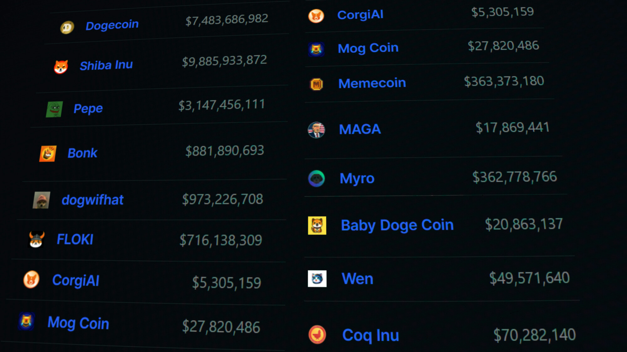 Wie in der Einleitung angedeutet, beginnen Memecoins oft als Witze oder Parodien, können aber einen erheblichen Wert und eine starke Anhängerschaft gewinnen. Ihr Wert wird durch ein Narrativ, virales Marketing und die Unterstützung durch Prominente bestimmt und nicht durch grundlegende Finanzkennzahlen oder Anwendungsfälle. Dies steht in scharfem Gegensatz zur traditionellen Betrachtungsweise von Vermögenswerten, die den Schwerpunkt auf Fundamentaldaten wie Produkte, Design, Geschäftsmodelle, Gründerteam oder detaillierte Roadmaps legt. Im Folgenden befinden sich einige Beispiele für beliebte Memecoins auf Solana.