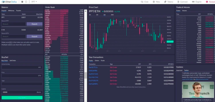 Während des Initial Coin Offering Booms im Jahr 2017 - mit dem Launch hunderter neuer Projekte - wuchs auch der Marktbedarf nach einer dezentralen Börse (DEX) für freies und erlaubnisfreies Handeln. Etherdelta - der erste Ethereum-DEX (siehe Bild 1) - ermöglichte den Transfer von Krypto-Assets mithilfe von Smart Contracts und versuchte, diesen Marktbedarf zu decken.