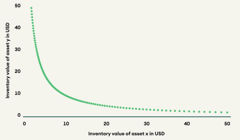 Die von Uniswap popularisierten Automated Market Maker (AMMs) sind der beliebteste Typ von DEX. Anstatt Orderbücher zu verwenden, werden Vermögenswerte algorithmisch mit einer konstanten Produktformel xy=k bepreist. Liquiditätsanbieter (LPs) poolen ihre Token, gegen die Händler ihre Trades eingeben können und einen Bruchteil des Handelswertes als Gebühren abgeben. Das Produkt des Token-Pools (xy) muss nach dem Handel gleich bleiben (d.h. gleich der Konstante k), weshalb es als "konstante Produktformel" bekannt ist.