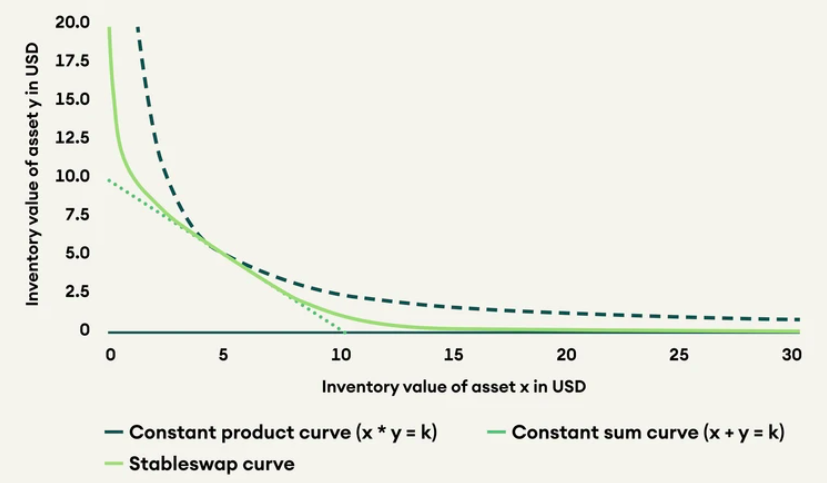 Das Constant Sum Model ermöglicht grosse Transaktionen mit geringer Slippage für ähnliche" Assets / Stablecoins wie TUSD, USDT, USDC und DAI oder Wrapped und synthetische Token wie WBTC, renBTC und sBTC. Da der Preis typischerweise innerhalb einer Spanne bleibt, ist Impermanent Loss kein Merkmal von "Stableswaps". LPs verdienen Transaktionsgebühren, während sie das Risiko eines De-Peggings eines Assets akzeptieren.