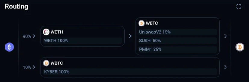 Einige der bekannteren Implementierungen sind 1inch, Metamask, Zerion und 0x. Aggregatoren finden automatisch den besten Preis für die Nutzer aus den zugrundeliegenden DEXen und teilen die Order sogar unter ihnen auf, um die geringste Slippage und Transaktionskosten zu gewährleisten, wie in Bild 2 zu sehen ist.