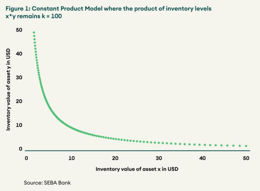 Die von Uniswap popularisierten Automated Market Maker (AMMs) sind der beliebteste Typ von DEX. Anstatt Orderbücher zu verwenden, werden Vermögenswerte algorithmisch mit einer konstanten Produktformel xy=k bepreist. Liquiditätsanbieter (LPs) poolen ihre Token, gegen die Händler ihre Trades eingeben können und einen Bruchteil des Handelswertes als Gebühren abgeben. Das Produkt des Token-Pools (xy) muss nach dem Handel gleich bleiben (d.h. gleich der Konstante k), weshalb es als "konstante Produktformel" bekannt ist.