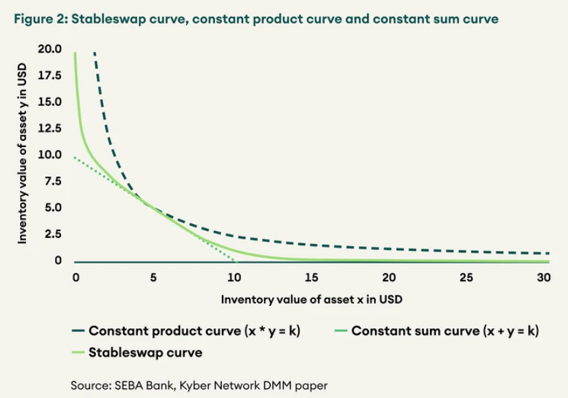 Das Constant Sum Model ermöglicht grosse Transaktionen mit geringer Slippage für ähnliche" Assets / Stablecoins wie TUSD, USDT, USDC und DAI oder Wrapped und synthetische Token wie WBTC, renBTC und sBTC. Da der Preis typischerweise innerhalb einer Spanne bleibt, ist Impermanent Loss kein Merkmal von "Stableswaps". LPs verdienen Transaktionsgebühren, während sie das Risiko eines De-Peggings eines Assets akzeptieren.