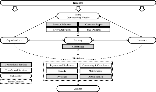 Wie wir bereits gelernt haben, birgt die Blockchain-Technologie das Potenzial das traditionelle Finanzwesen auf infrastruktureller Ebene neuzugestalten, indem sie die Notwendigkeit von Banken und Zahlungsdienstleistern reduziert und deren Rollen auf das Blockchain-Netzwerk überträgt. An dieser Stelle ist es wichtig anzumerken, dass nicht alle Intermediäre überflüssig werden. Zum Beispiel spielen Regulierungs- und Aufsichtsbehörden, Rechtsexperten und externe Prüfer in diesem Ökosystem weiterhin eine unerlässliche Rolle. Trotz gegenteiliger Behauptungen glauben wir, dass die Blockchain nicht alle Intermediäre überflüssig machen wird. Ähnlich wie Krypto-Börsen zusätzliche Dienstleistungen für ICO-Token anboten, können Crowdfunding-Plattformen im Rahmen von Due-Diligence-Prüfungen unterstützen.