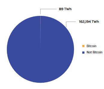 Als erstes geht der CoinShares-Bericht auf konkrete Zahlen ein. Verglichen wird Bitcoins Stromverbrauch vorerst mit dem gesamten Energieverbrauch, der andersweitig anfällt. Der jährliche Durchschnitt für Bitcoin liegt (Stand Dezember 2021) bei 89 Terrawattstunden (TWh). Dabei handelt es sich um einen vernachlässigbaren Teil (rund 0.05%) des weltweiten Energieverbrauchs.