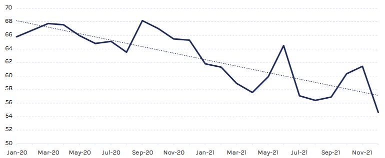 Stand Dezember 2021 sind um die 5 Millionen Hardwaregeräte im Einsatz, die Transaktionen auf der Bitcoin-Blockchain verifizieren. Nach dem Mining-Verbot in China gab es zwar für kurze Zeit einen Einbruch von geschätzten 30 bis 40%, doch die Anzahl der Mining-Geräte hat sich rasch wieder erholt. Wie erwartet sind neuere Computer effizienter als alte, wodurch ein Wettlauf hin zur Effizienz geschaffen wird. Wie sich anhand einer Grafik erkennen lässt, resultiert dies in einer höheren Netzwerkeffizienz über die Jahre.