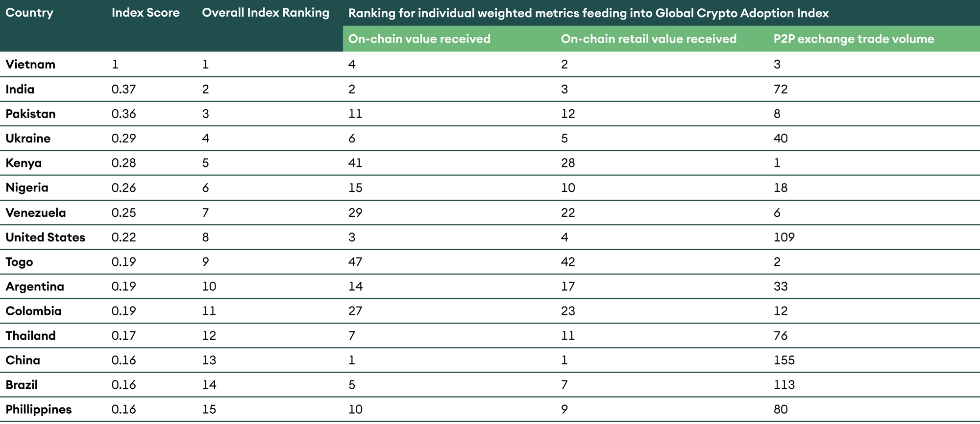 Einem Chainalysis-Bericht aus dem Jahr 2021 zufolge sind die Schwellenländer die Länder mit der höchsten Adoption von Kryptowährungen, wobei Vietnam, Indien und Pakistan die ersten drei Plätze belegen. Mehr als 80% der 15 grössten Nutzer von Kryptowährungen kommen aus Entwicklungsländern, wie die folgende Tabelle zeigt. Dies deutet darauf hin, dass Kryptowährungen Dienstleistungen anbieten, zu denen diese Menschen sonst keinen Zugang hätten.