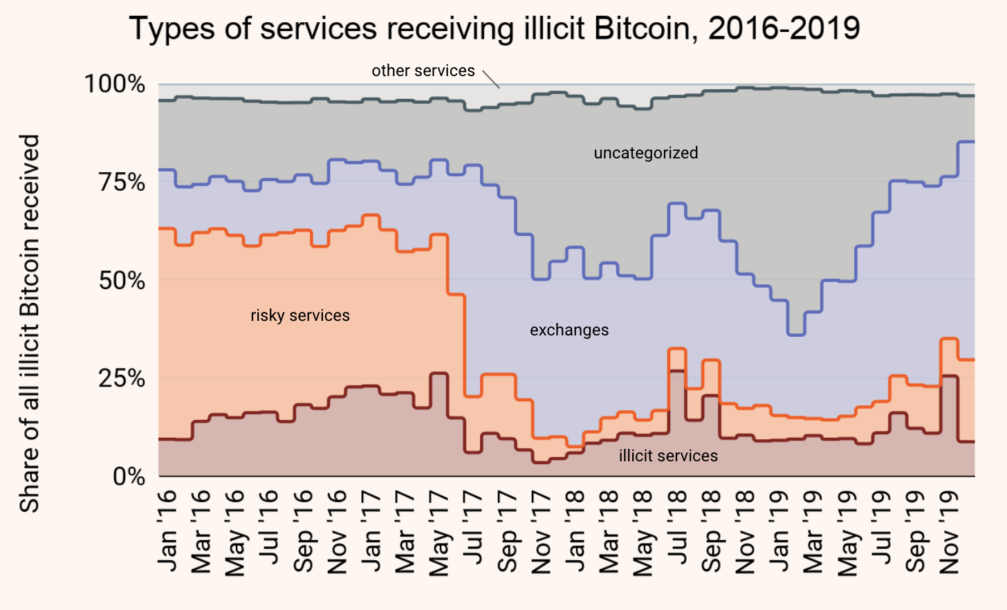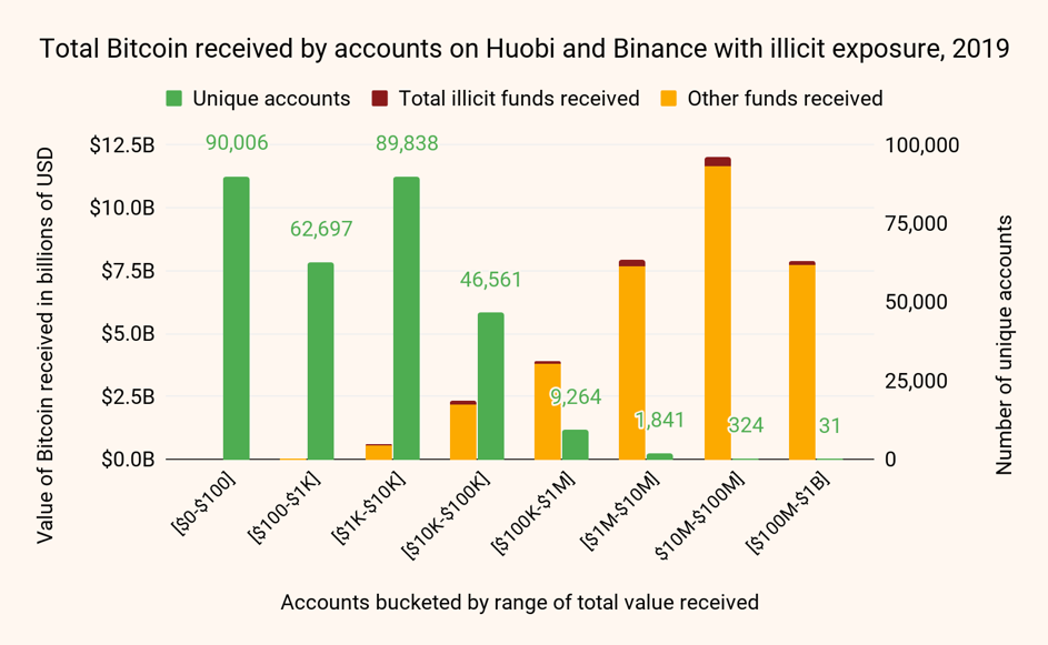 Während Börsen schon immer ein beliebter Ausweg für illegale Krypto-Währungen waren, haben sie seit Anfang 2019 einen stetig wachsenden Anteil eingenommen. So konnten laut Chainalysis rund 2,8 Milliarden Dollar an illegalen Krypto-Währungen zurückverfolgt werden, die von kriminellen Entitäten an Kryptobörsen gelangt sind. Davon sind mehr als 50% an die beiden Plattformen Binance und Houbi geflossen. Insgesamt erhielten 2019 etwas mehr als 300'000 Einzelkonten bei Binance und Huobi, Bitcoin aus kriminellen Quellen.