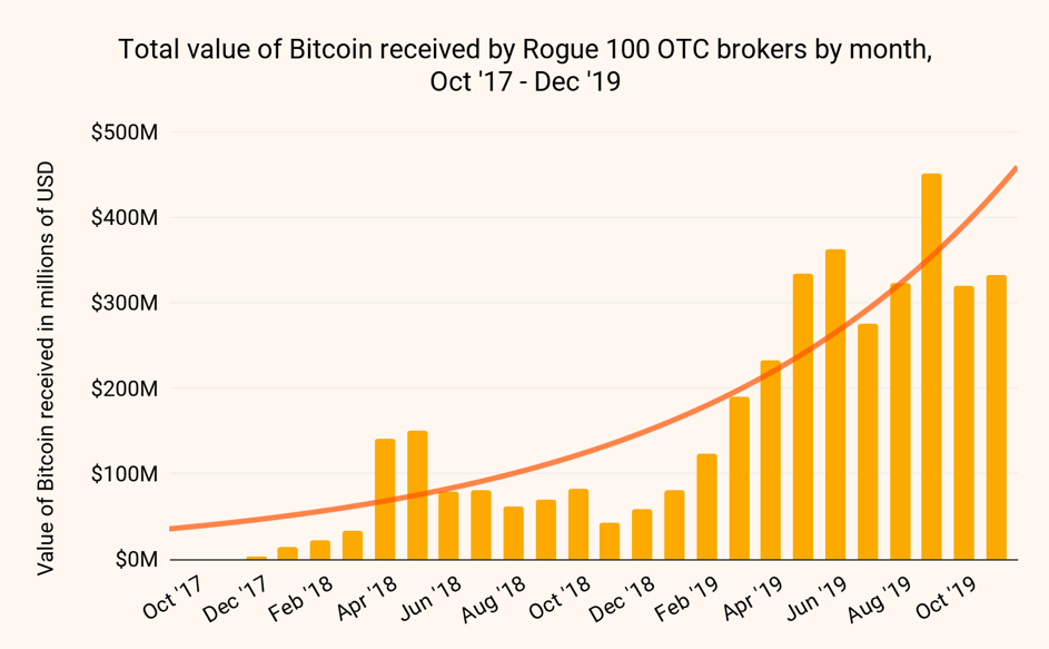 Chainanalysis hat aus der Analyse der Transaktionen verschiedener krimineller Gruppen eine Liste von 100 großen OTC-Maklern zusammengestellt, die nach Meinung des Unternehmens Geldwäsche-Dienstleistungen anbieten. Die Rogue 100 sind äußerst aktive Händler und haben einen immensen Einfluss auf das Kryptogeld-Ökosystem. Seit Ende 2017 erhalten sie jeden Monat stetig steigende Beträge an Krypto-währungen. Ihre Aktivität ist in 2019 Jahr stark angestiegen. Alleine im Jahre 2019 haben die OTC-Makler mehr als 3 Milliarden Dollar in Form von Bitcoin erhalten, viele davon spielten eine wesentliche Rolle beim PlusToken-Betrug. 70 der OTC-Makler der Rogue 100 gehören dabei zu der Gruppe von Huobi-Konten, die Bitcoin aus illegalen Quellen erhalten.