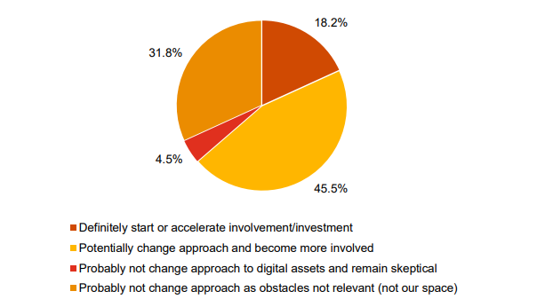 Rund zwei Drittel der Befragten gaben an, dass sie bei einer Beseitigung der Haupthindernisse entweder ihre Investitionen in digitale Assets aktiv beschleunigen oder ihren Ansatz ändern und sich stärker involvieren würden. Der Rest (32%) denkt nicht, dass die Beseitigung der Hindernisse einen Einfluss auf ihren derzeitigen Ansatz haben würde. Grund dafür ist, dass Investitionen in digitale Assets weiterhin ausserhalb ihres Mandats liegen.