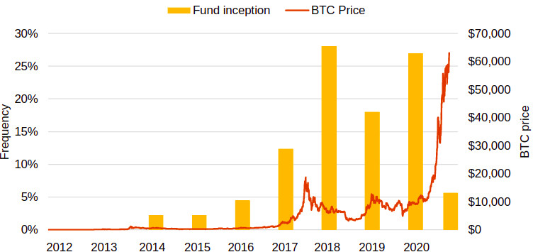 Die Lancierung von aktiv verwalteten Krypto-Fonds korreliert laut PwC stark mit dem Preis von Bitcoin (BTC). Der Preisanstieg im Jahr 2017 scheint ein Katalysator für weitere Krypto-Fonds gewesen zu sein, während der Preiseinbruch im Jahr darauf zu einem Rückgang führte. 18% der Umfrageteilnehmer starteten ihre Fonds im Jahr 2020, als die Preise wieder zulegten.
