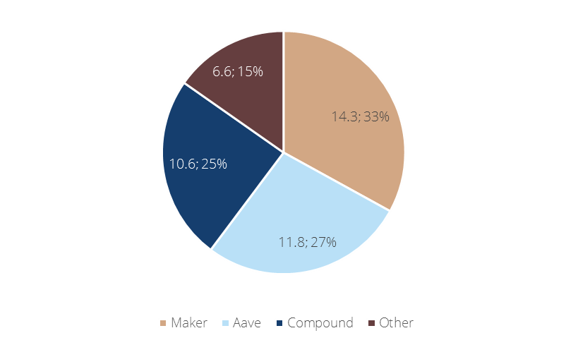 Die Ethereum-Blockchain bildet die Grundlage für populäre DeFi-Kreditprotokolle wie Compound, Aave und MakerDAO. 85 Prozent oder 37 Mrd. USD von insgesamt 43 Mrd. USD an Wert, die bei Kreditprotokollen hinterlegt wurden, befinden sich auf diesen Protokollen.