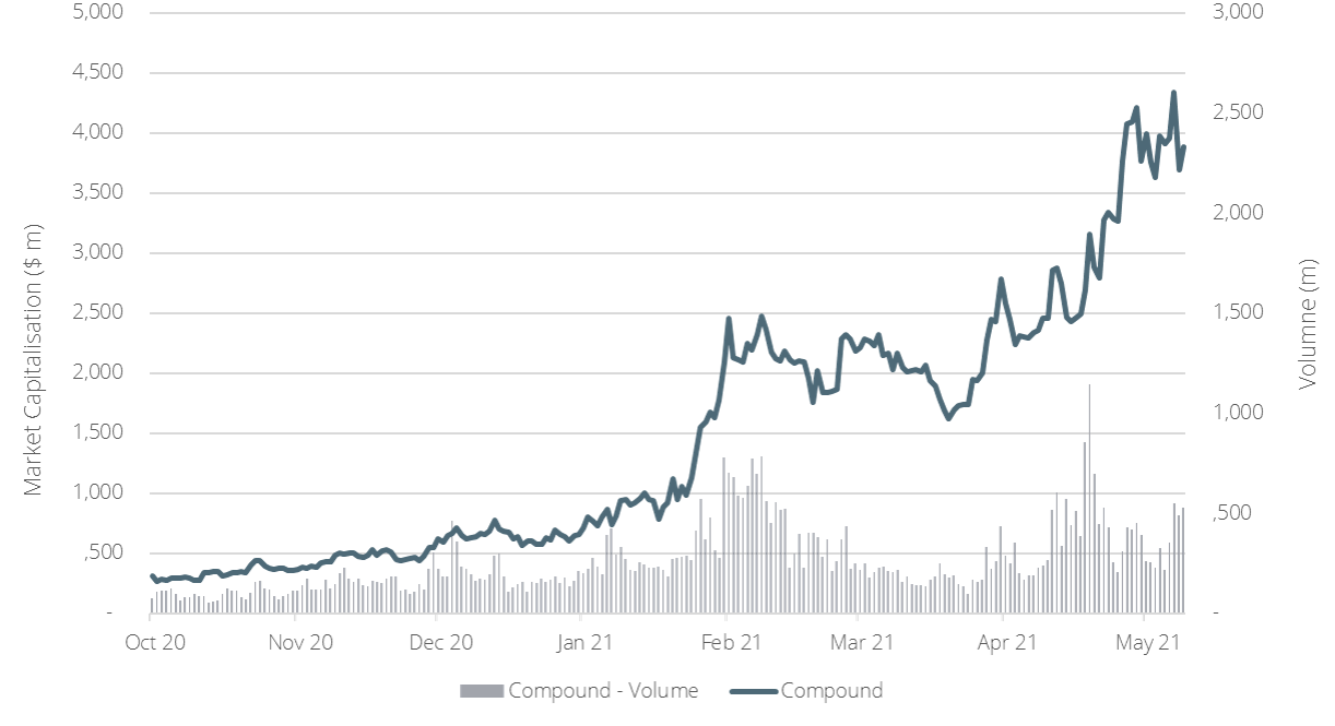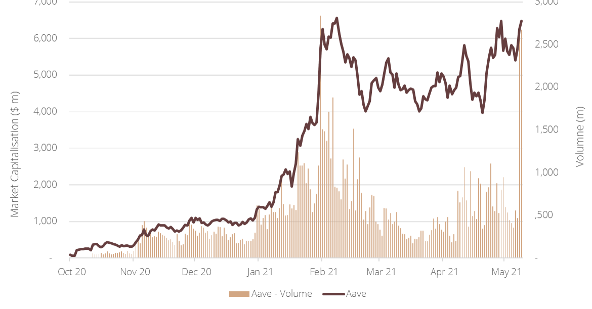 Seit dem Oktober 2020, ist die Marktkapitalisierung Aaves von 89 Mio. USD auf fast 6.5 Mrd. USD gestiegen. Der Token hat damit COMP und MKR im Wert und im gehandelten Volumen schnell überholt, wobei in der letzten Woche fast ein Rekordvolumen erzielt wurde (siehe Grafiken unten).