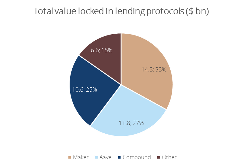Die Ethereum-Blockchain bildet die Grundlage für populäre DeFi-Kreditprotokolle wie Compound, Aave und MakerDAO. 85 Prozent oder 37 Mrd. USD von insgesamt 43 Mrd. USD an Wert, die bei Kreditprotokollen hinterlegt wurden, befinden sich auf diesen Protokollen.