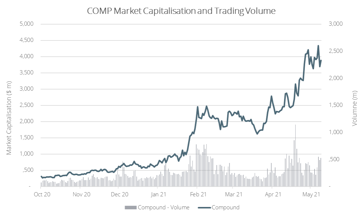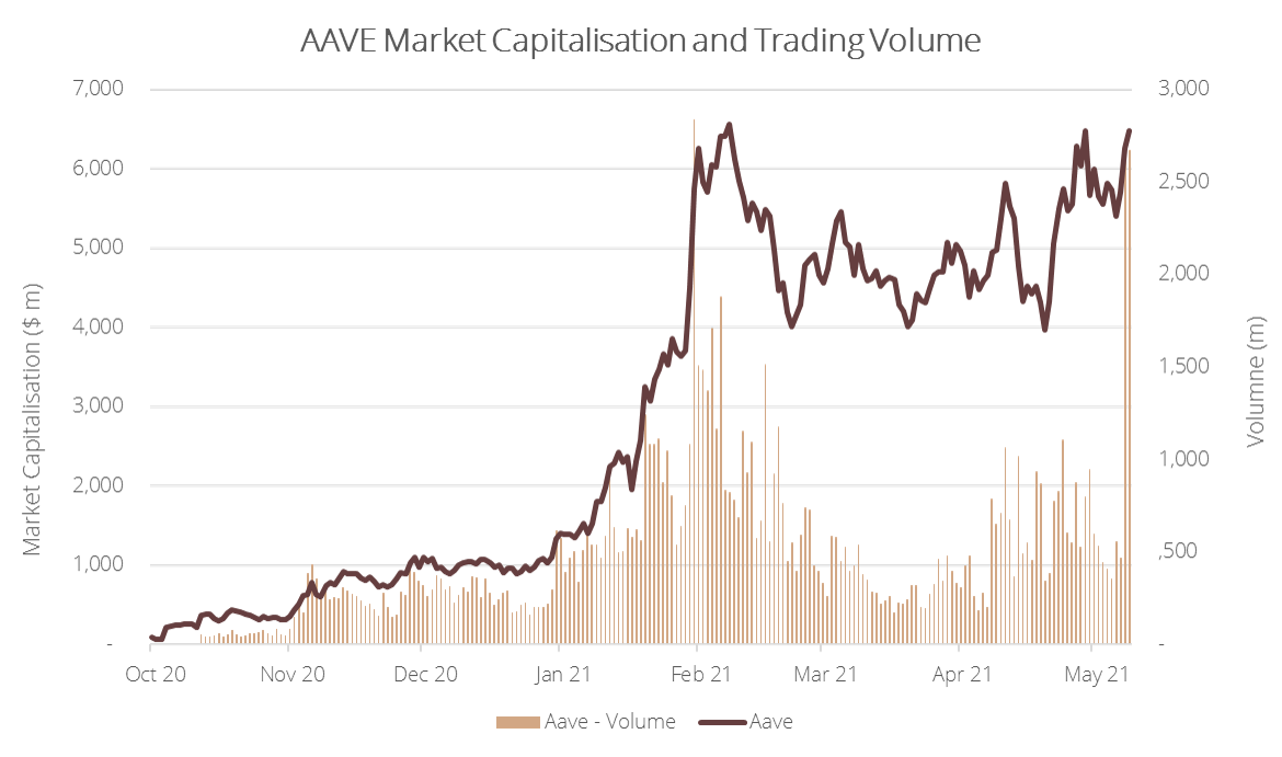 Seit dem Oktober 2020, ist die Marktkapitalisierung Aaves von 89 Mio. USD auf fast 6.5 Mrd. USD gestiegen. Der Token hat damit COMP und MKR im Wert und im gehandelten Volumen schnell überholt, wobei in der letzten Woche fast ein Rekordvolumen erzielt wurde (siehe Grafiken unten).
