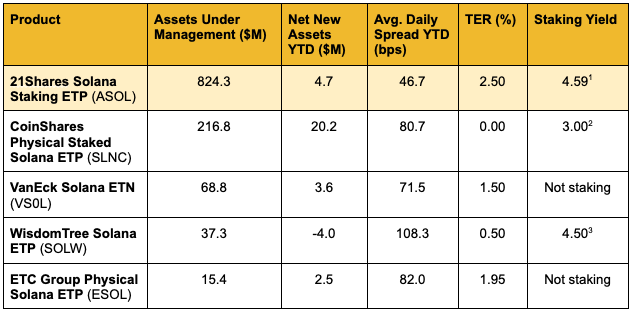 Dennoch ist Sui mit einer treuen Entwicklerbasis und den Schlüsseleigenschaften niedriger Kosten und hoher Geschwindigkeit gut positioniert, um sich Solanas Marktanteil als noch schlankerer Abwicklungslayer zu sichern. Sui könnte als interessante Investition für Anleger gelten, die ein höheres Risiko eingehen möchten. Im Vergleich zu Solana weist Sui eine Beta von 1.23 auf und könnte als potenzielle Satelliteninvestition zur Ergänzung eines Krypto-Portfolios dienen. Für Investoren, die an einer regulierten Investitionsmöglichkeit in Solana interessiert sind, stehen folgende ETPs auf dem europäischen Markt zur Verfügung. Abbildung 10 zeigt Daten vom 13. August 2024. Der durchschnittliche tägliche Spread YTD (bps) bezieht sich auf den besten täglichen durchschnittlichen Bid/Ask-Spread dieses Jahres an europäischen Börsen.