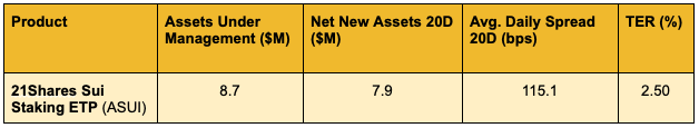 Vor dem Hintergrund des Wachstums von Sui in diesem Jahr hat 21Shares eine Lösung für europäische Investoren bereitgestellt, die in Sui über ein reguliertes Investitionsvehikel investieren möchten: ASUI. Abbildung 11 gibt einen Überblick über das Produkt. Der durchschnittliche tägliche Spread der letzten 20 Tage (bps) bezieht sich auf den besten täglichen durchschnittlichen Bid/Ask-Spread der letzten 20 Tage an europäischen Börsen. ASUI ist das einzige Sui-ETP auf dem europäischen Markt.
