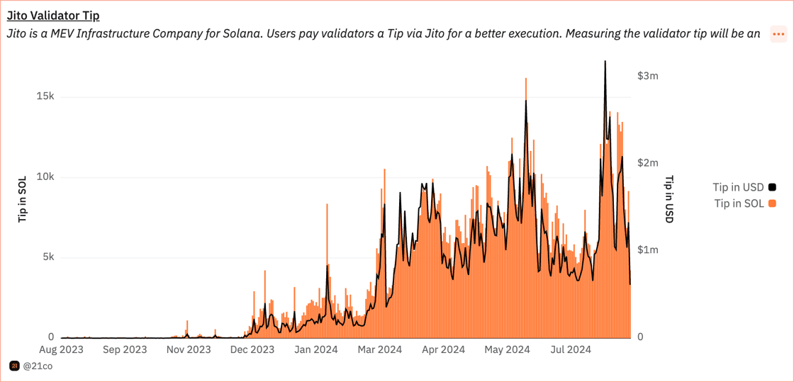 Um Netzwerküberlastungen zu begegnen und Validatoren zu motivieren, ist Jito ein wichtiger Baustein für Solana. Der Validator ermöglicht es Stakern, Belohnungen zu steigern und gleichzeitig Netzwerküberlastungen zu reduzieren. Die über Jito gezahlten Tips beweisen Solanas finanzielle Möglichkeiten. Dank Solanas florierendem Ökosystem erreichten die Jito-Validator-Tips am 27. Juli mit 17'290 SOL (ca. 3.19 Millionen Dollar) einen historischen Höchststand. Zum Vergleich: Zur gleichen Zeit wurden 68'000 Tokens auf Solana geprägt (engl. = minted).