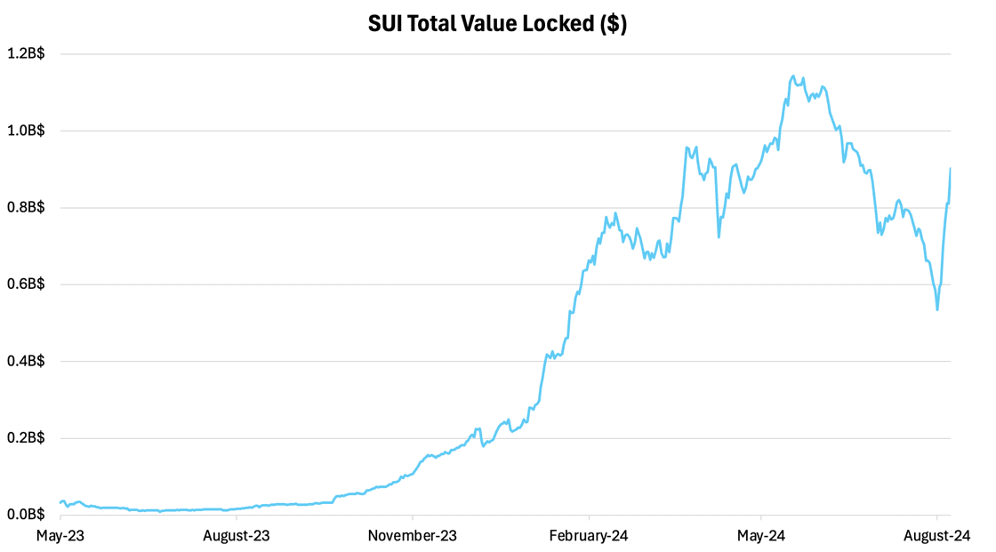 Total Value Locked (TVL) ist ein Mass für den Gesamtwert der in einem Smart Contract oder DeFi-Plattform gesperrten Vermögenswerte. Das TVL kann als gesamt verwaltetes Vermögen betrachtet werden. In dieser Hinsicht hat Sui kürzlich einen massiven Anstieg verzeichnet. In Dollar ausgedrückt ist Sui’s TVL innerhalb einer Woche von 498.65 Millionen Dollar auf 902.2 Millionen Dollar gestiegen!
