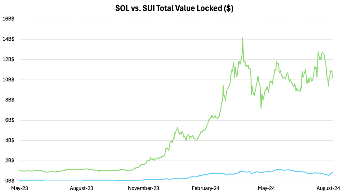 Gleichzeit erlebten Märkte einen Verkaufsdruck, der die Marktkapitalisierung des Kryptomarktes über Nacht um 17% senkte. Im Vergleich zu anderen Vermögenswerten blieb Sui weitgehend unberührt und erwies sich als einer der grössten Nutzniesser (Abbildung 1). In der Vergangenheit stellte sich oft die Frage: "Wird Solana Ethereum überholen?" Doch jetzt taucht eine neue Herausforderung auf: Könnte Sui Solana überholen, bei einer aktuellen Marktkapitalisierung von 68.6 Milliarden Dollar? Das ist die neue 68 Milliarden Dollar-Frage.