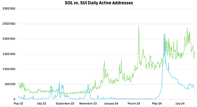 Sui verzeichnete einen beeindruckenden Sprung von aktiven Adressen Ende Mai dieses Jahres. Am 23. Mai erreichten die Blockchain einen Höchststand von 2.2 Millionen täglichen Nutzern und übertraf damit Solanas 1.4 Millionen. Ein Blick auf Abbildung 5 macht aber eines deutlich. Suis Dynamik wird weitgehend durch Aktivitätsspitzen getrieben, wie im August 2023, November 2023 und Mai 2024 zu sehen ist. Der jüngste Anstieg, der mit der Testnet-Einführung von Mysticeti verbunden war, hat zu einer treueren Nutzerschaft geführt. Dies ist daran zu erkennen, dass der anschliessende Rückgang deutlich langsamer verlief.