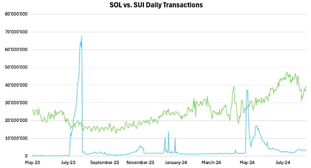 Solana hingegen verzeichnet ein viel nachhaltigeres Wachstum bei den aktiven Adressen. Um grössere Akzeptanz zu erreichen, muss Sui eine Konsistenz finden, um weiteres Wachstum zu gewährleisten. Dieser Trend ist auch bei den täglichen Transaktionen von Sui und Solana zu beobachten. Abbildung 6 zeichnet ein ähnliches Bild, dass Sui seine Aktivitäten über einen längeren Zeitraum aufrechterhalten muss, um eine gesunde Nutzerbasis aufzubauen. Diese würde schlussendlich dazu beitragen, das Netzwerk Mainstream zu machen.
