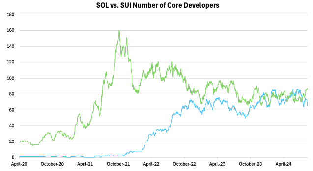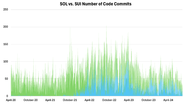 Wie in den folgenden Abbildungen zu sehen ist, hat Sui in den letzten Monaten ein aktives Entwickler-Ökosystem beibehalten, das mit der Grösse von Solana vergleichbar ist. Es ist wichtig zu beachten, dass Sui’s Code-Commits immer noch leicht hinter denen von Solana zurückbleiben. Die Bindung der Sui-Entwickler ist jedoch entscheidend für die Fähigkeit des Netzwerks, neue Funktionen für seine Nutzerbasis zu implementieren. Andererseits hat Solana seit Oktober 2021 fast die Hälfte seiner Entwicklerzahl verloren, da Entwickler möglicherweise nach alternativen Möglichkeiten suchen.