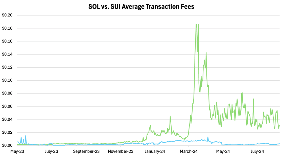 Es kann argumentiert werden, dass dies auf die relativ geringere Aktivität von Sui im Vergleich zu Solana zurückzuführen ist. Eine genauere Betrachtung zeigt jedoch, dass selbst während des Anstiegs der Transaktionen bei Sui im Mai die durchschnittliche Transaktionsgebühr nicht anstieg, sondern sank! Das Gegenteil ist bei Solana der Fall. Während des Höhepunkts des Solana-basierten Memecoin-Wahns im März dieses Jahres stieg die Anzahl der aktiven Adressen auf fast 2.5 Millionen, und die Transaktionsgebühren erreichten ihren Höhepunkt bei etwa 0.18 Dollar, was mehr als das Neunfache der Transaktionskosten bei Sui ausmacht.